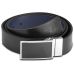 Ремень оборудован вращающейся пластинчатой пряжкой (Plate Buckle), которая позволяет моментально менять сторону. Пряжка выполнена в сдержанном современном стиле, с зеркальной хромированной рамкой и контрастной вставкой. Она имеет более массивный внешний вид по сравнению с классическими пряжками и крепится в отверстиях на ремне с помощью штифта, чем обеспечивает большую скорость застегивания и растегивания. Ширина ремня - 3.3 см, что делает его универсальным выбором для костюмных брюк, джинсов или чиносов.